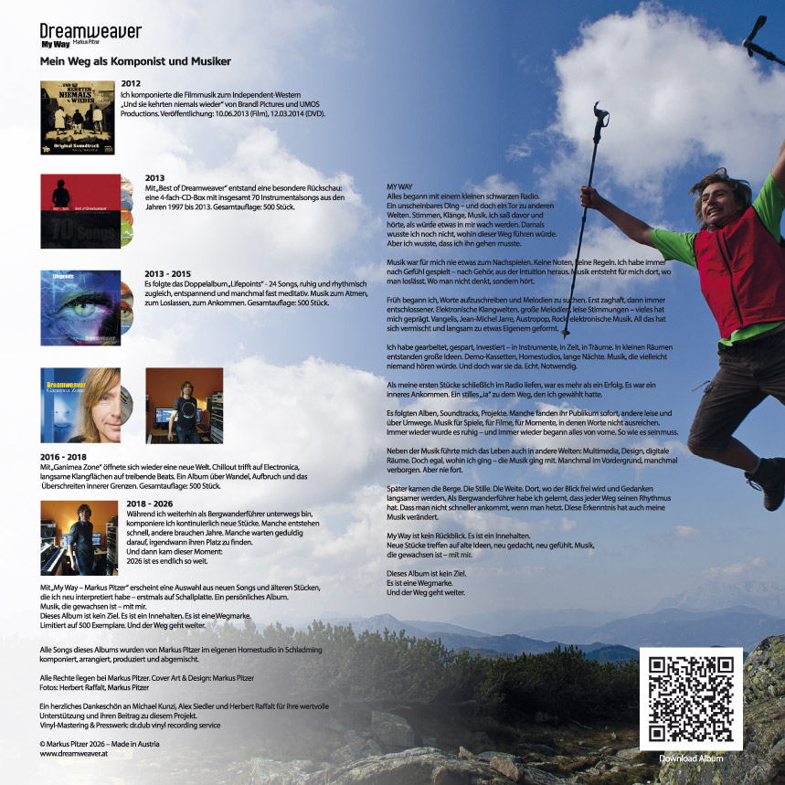 Dreamweaver, My Way - Markus Pitzer will be released as both a vinyl edition (record) and an audio CD with bonus tracks in a limited edition of only 500 copies each – a special collector's item for lovers of chillout tracks, fans and all those who want to not only hear music, but experience it.
